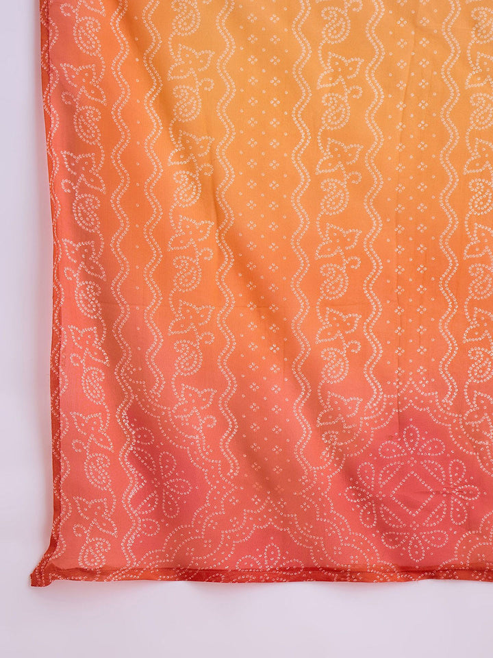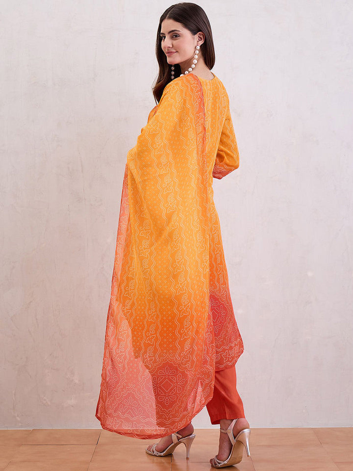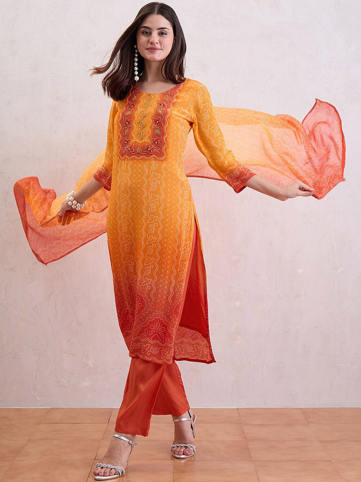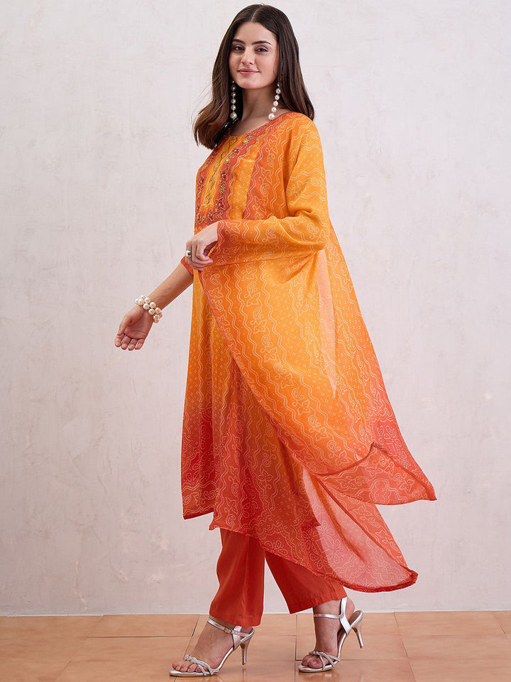 Bandhani Printed Beads and Stones Straight Kurta With Trousers & Dupatta