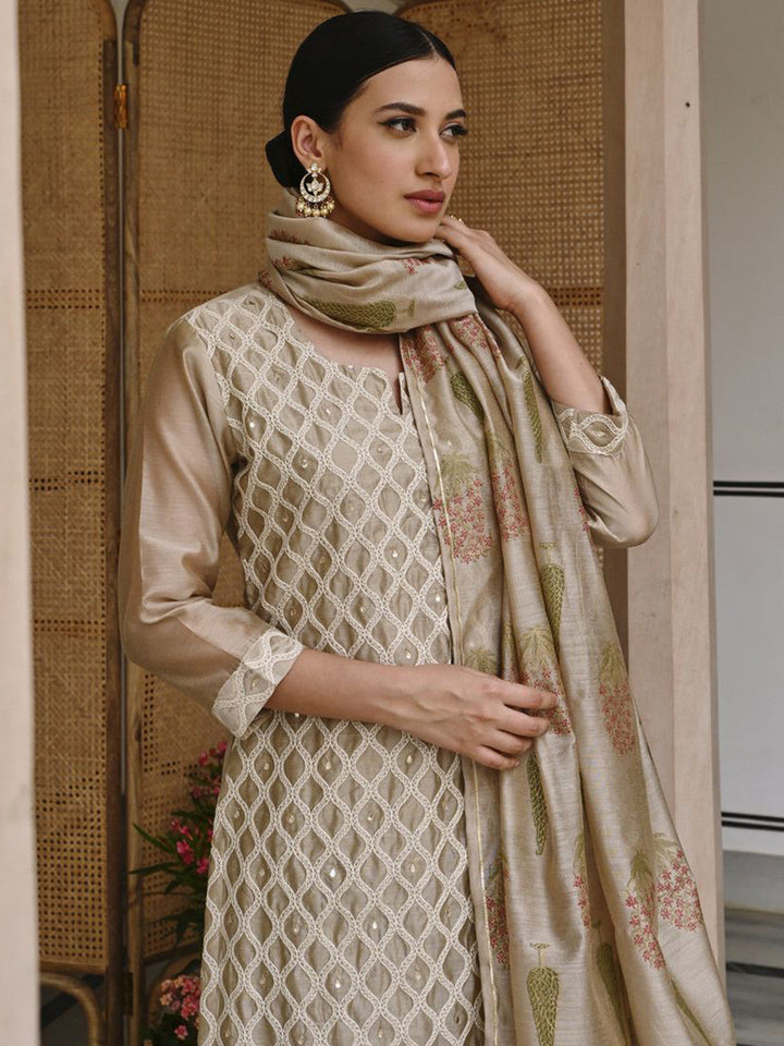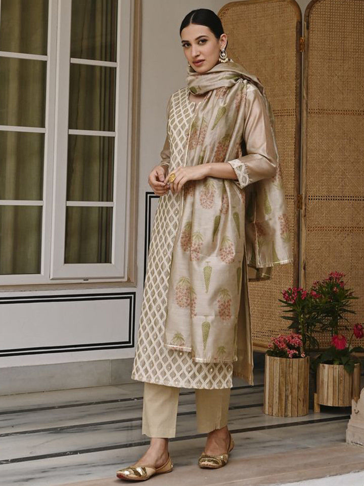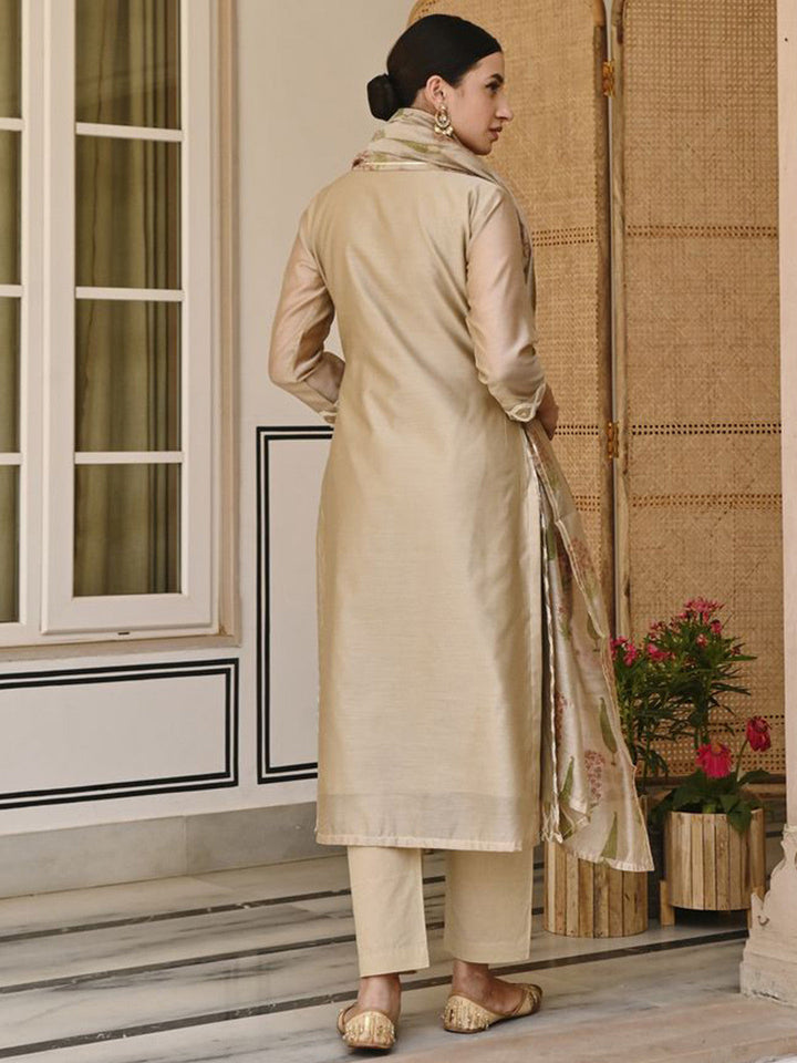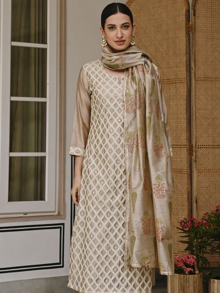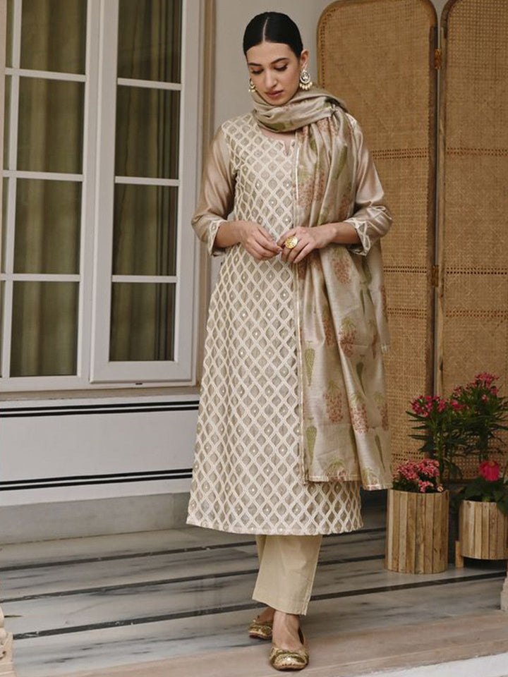 Embroidered Thread Work Chanderi Cotton Kurta With Trousers & Dupatta