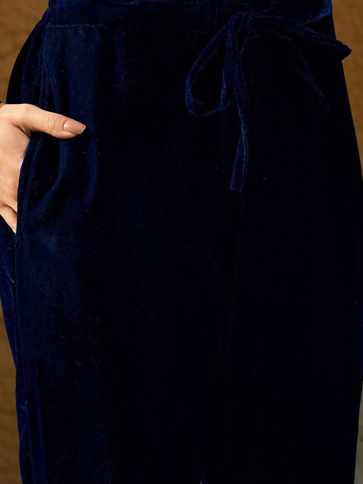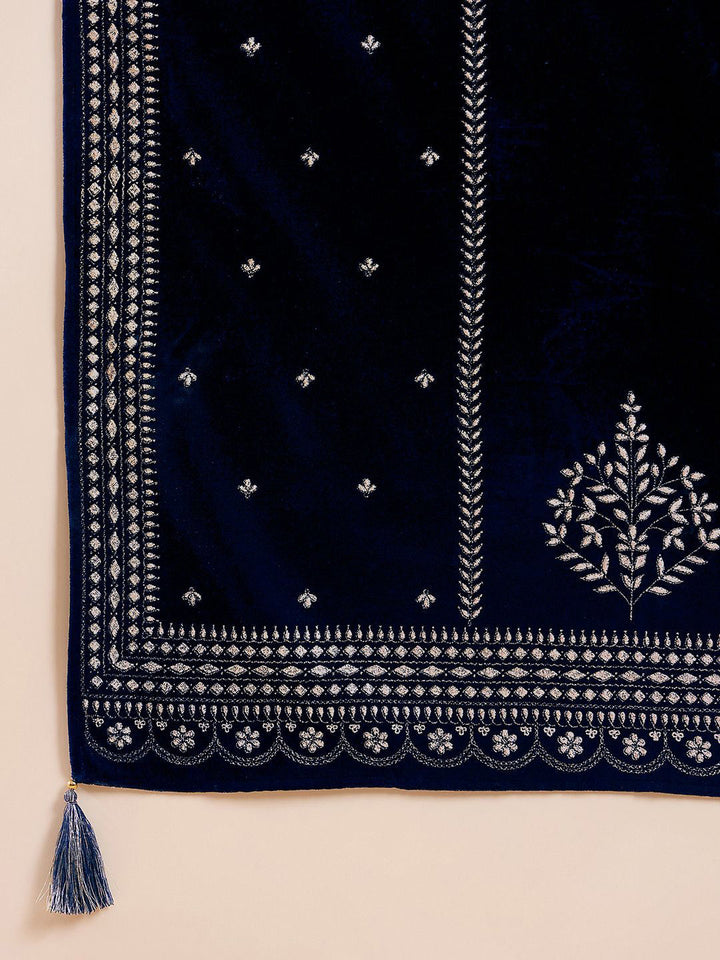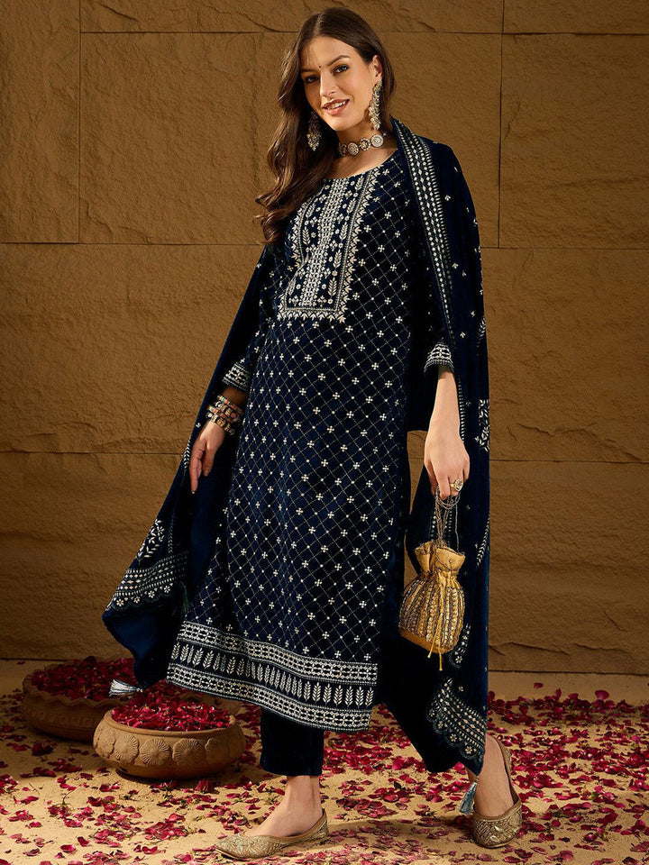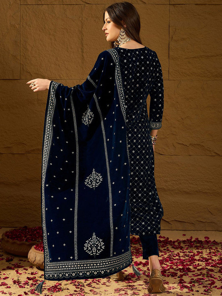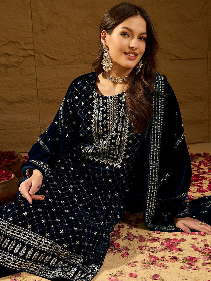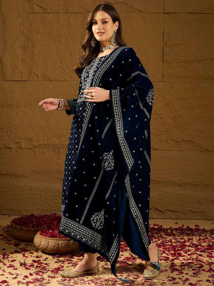 Embroidered Velvet Straight Kurta With Trousers And Dupatta