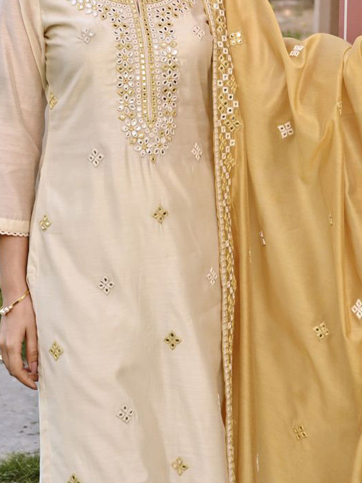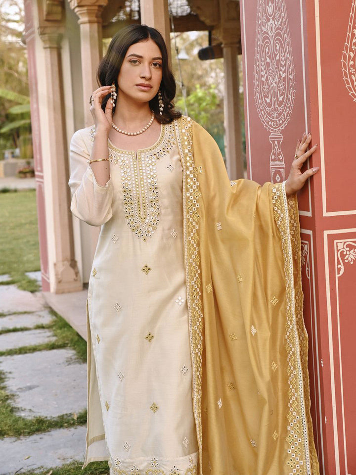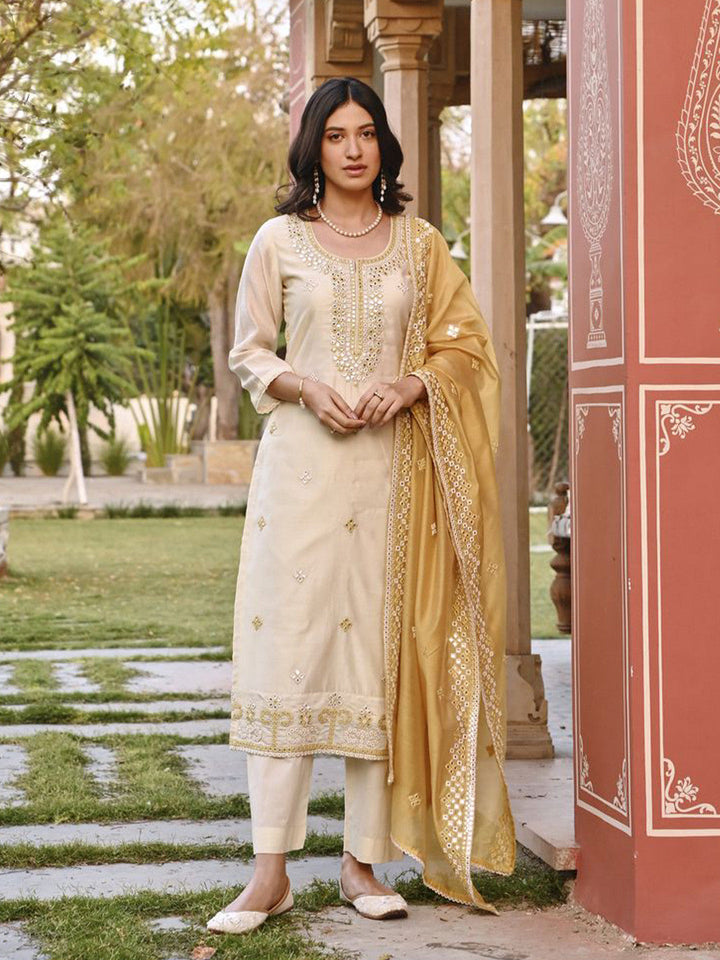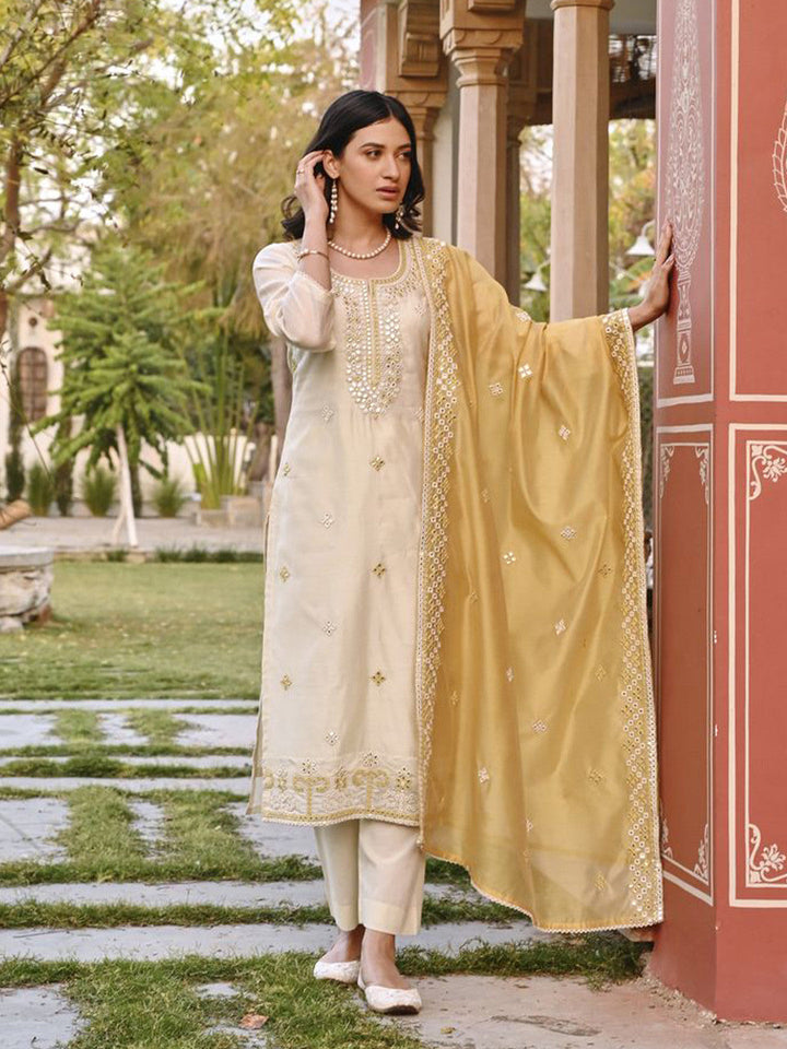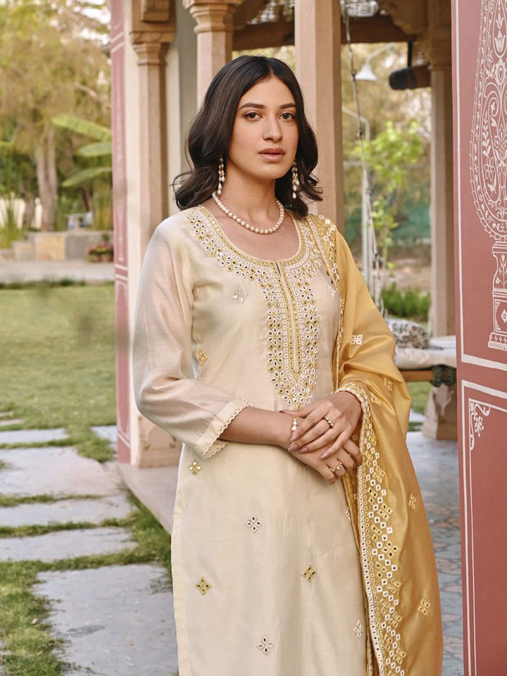 Floral Embroidered Chanderi Cotton Kurta With Trousers & Dupatta