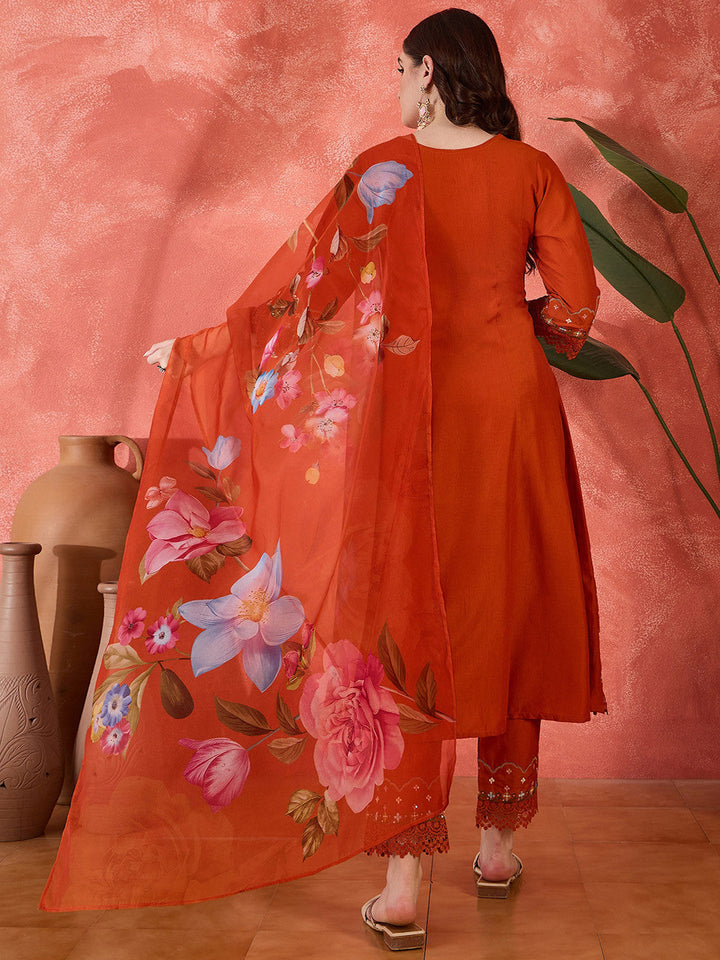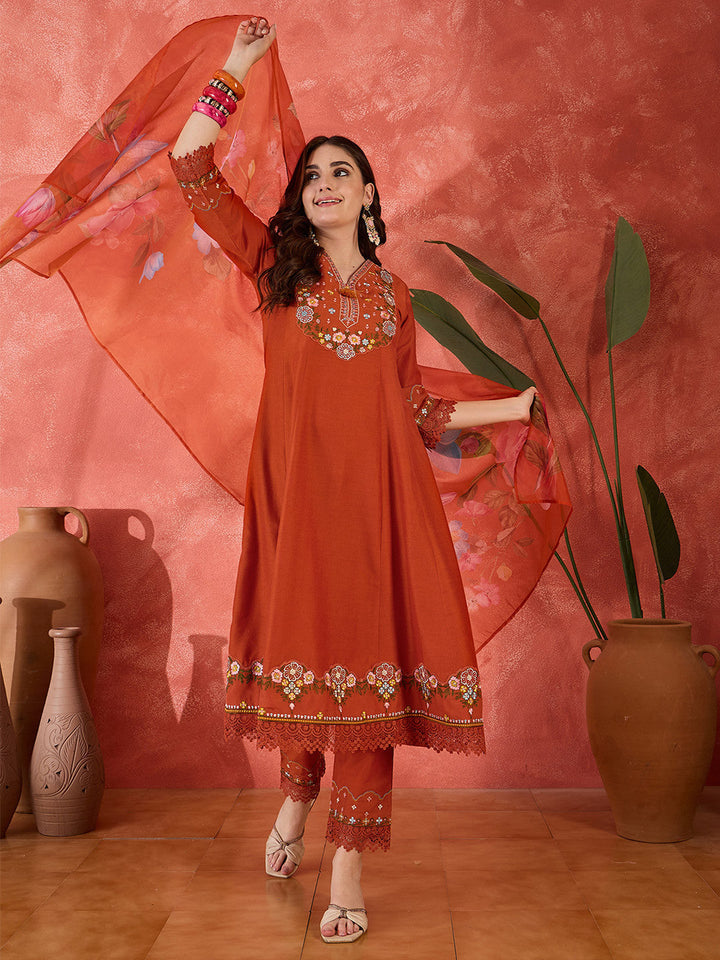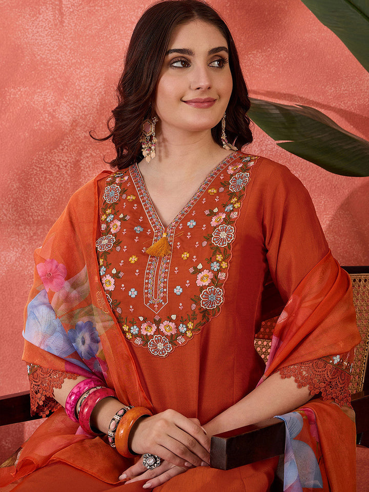 Floral Embroidered Schiffli Lace V-Neck Kurta With Trouser And Dupatta