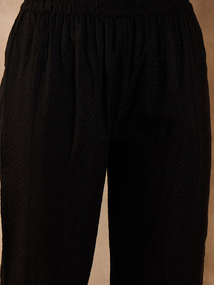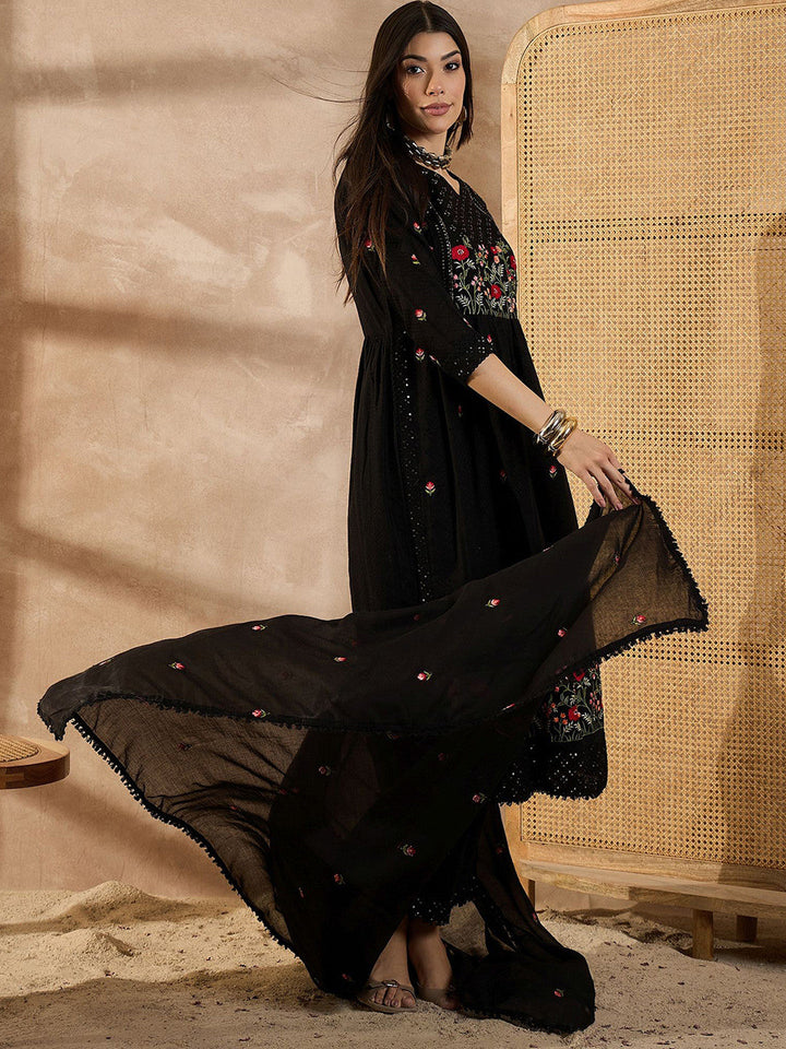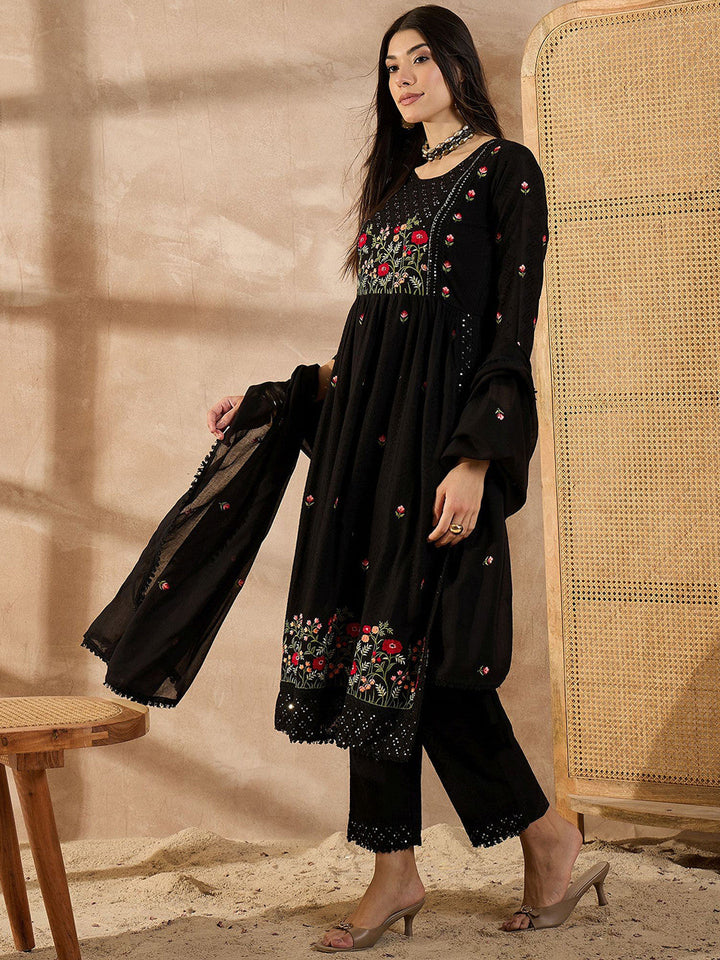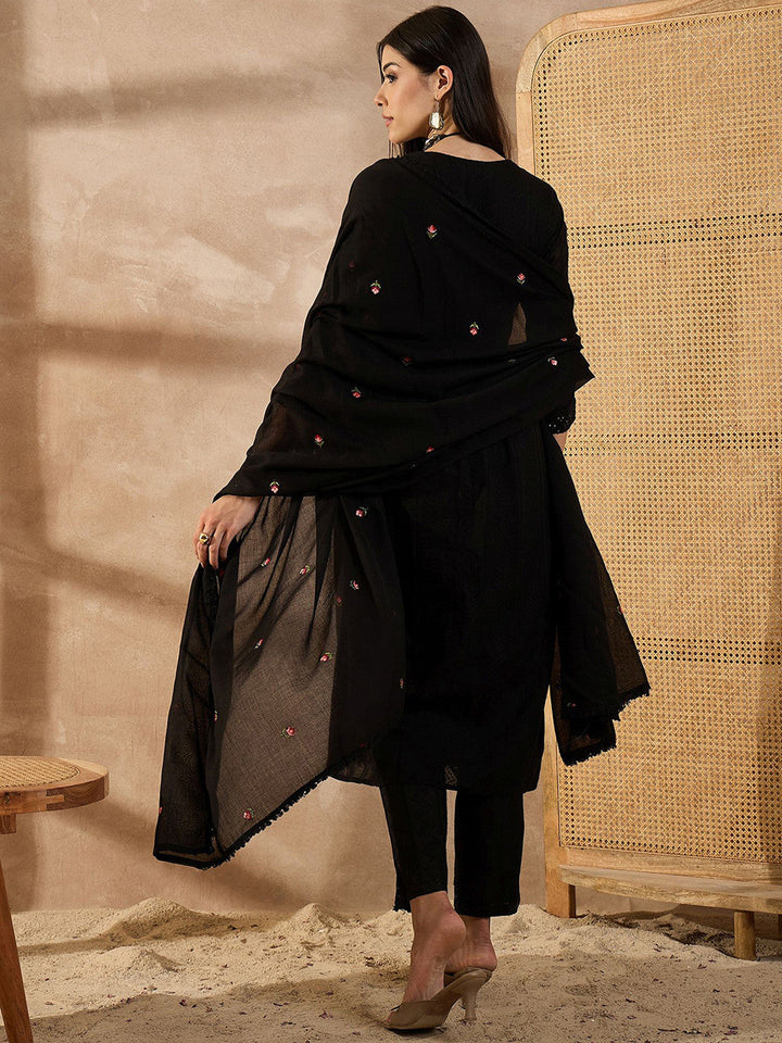 Floral Embroidered Thread Work Organic Cotton Straight Kurta With Trousers & Dupatta