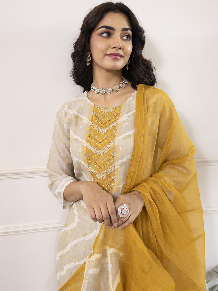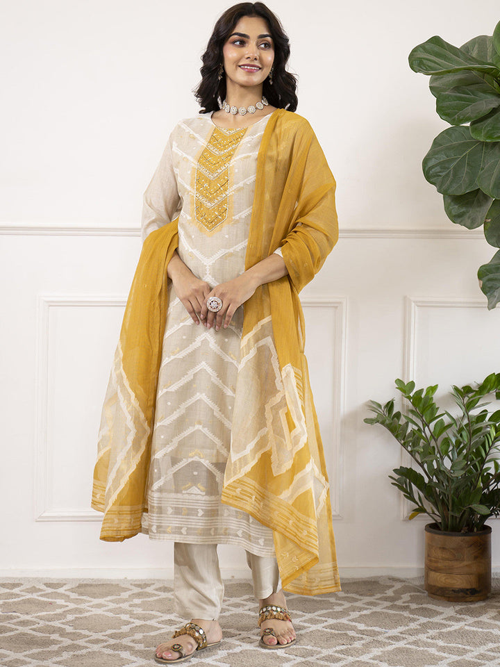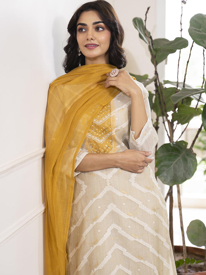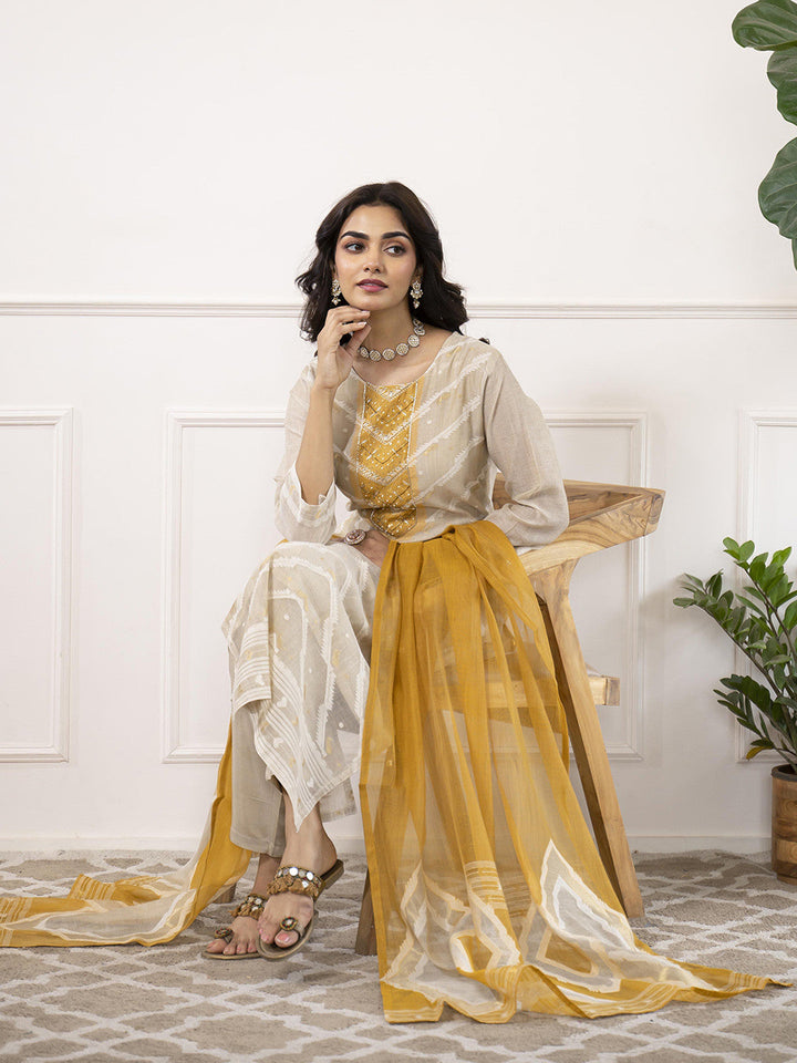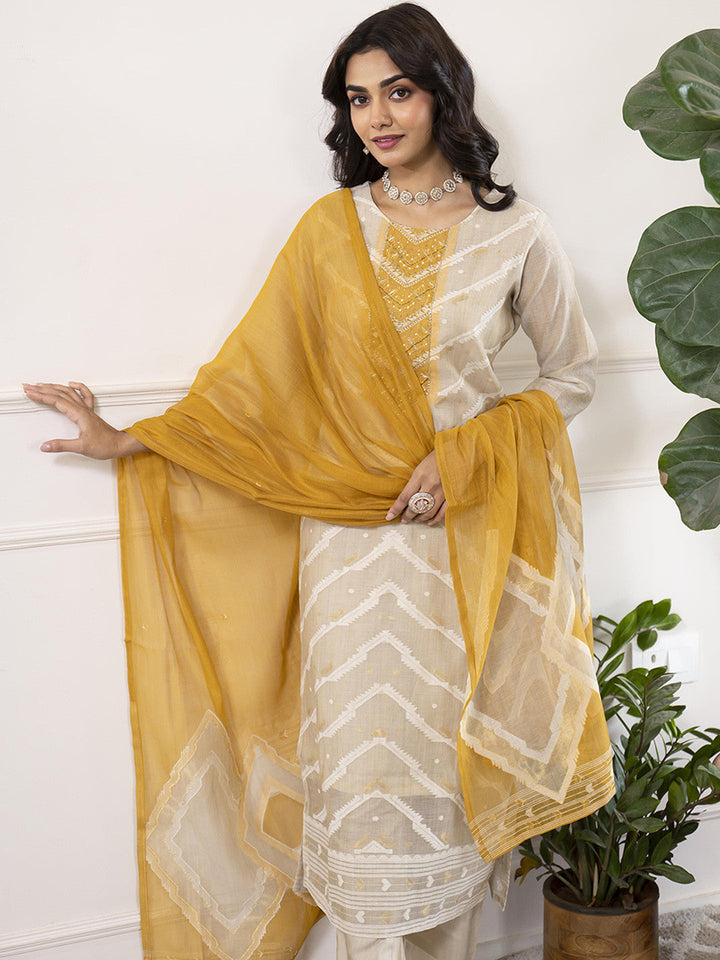Mustard Yellow Ethnic Motifs Embroidered Pure Cotton Kurta With Trousers & Dupatta