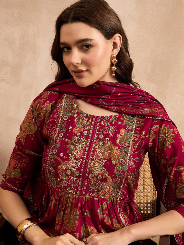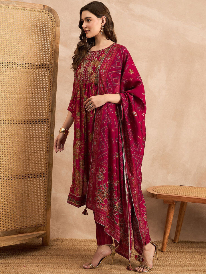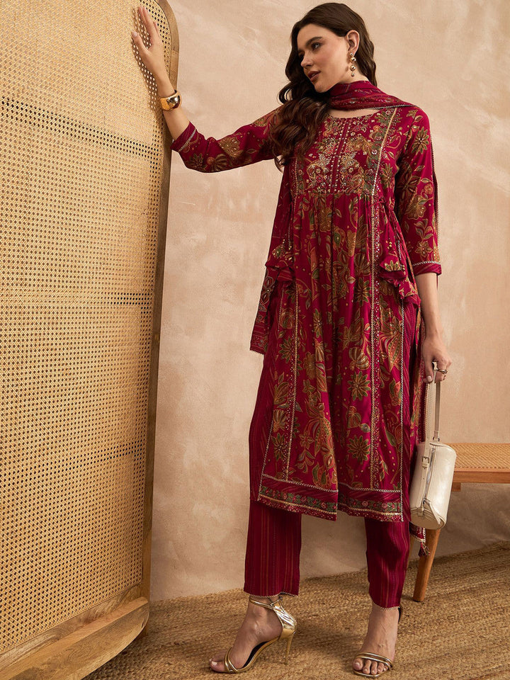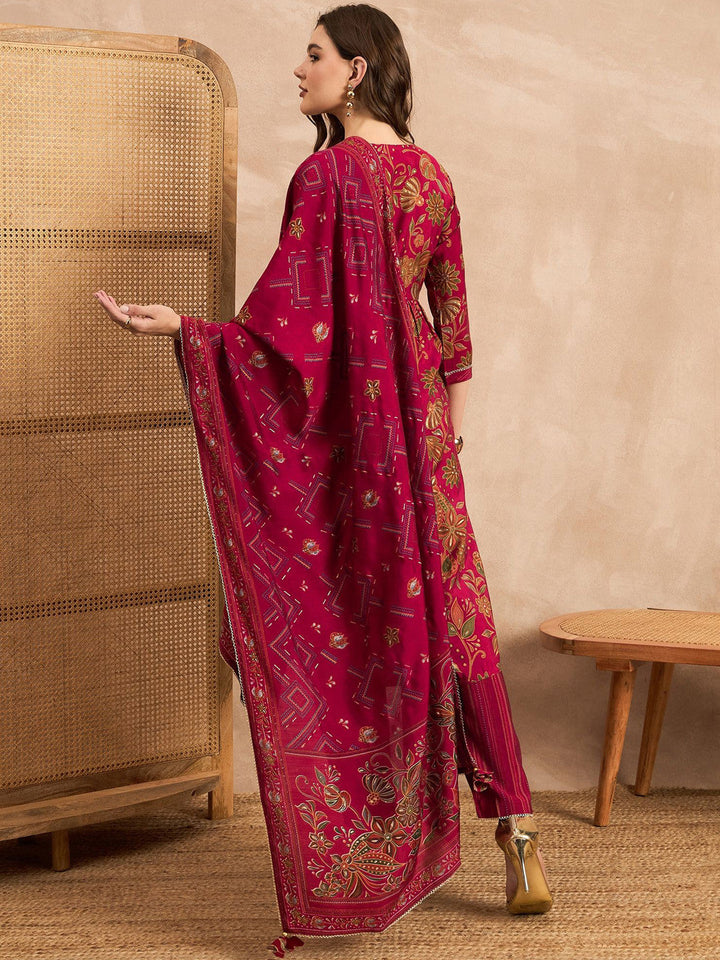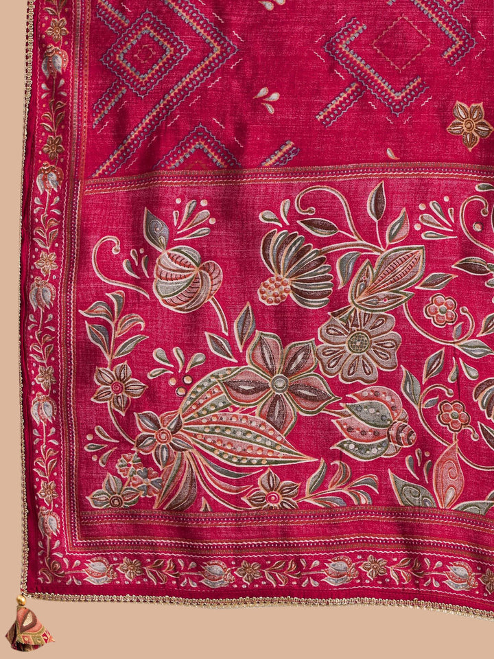 Red and Green Floral Printed Thread Work Chanderi Silk Kurta Set