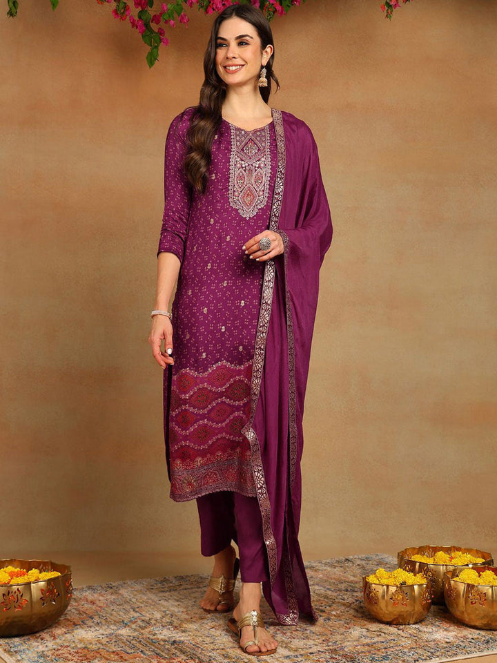 Women Bandhani Embroidered Kurta with Trousers & Dupatta