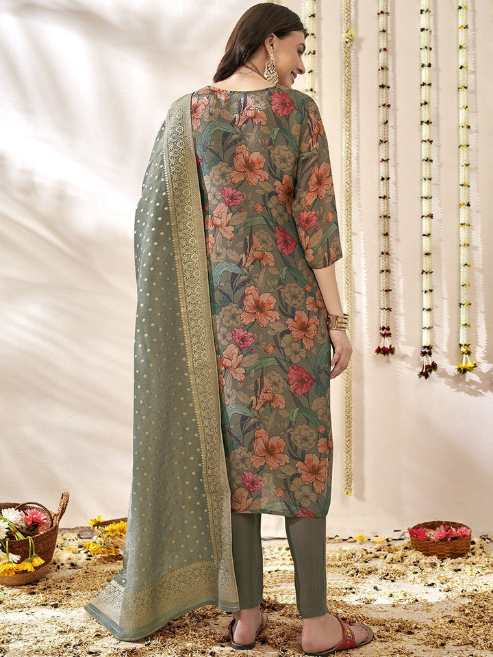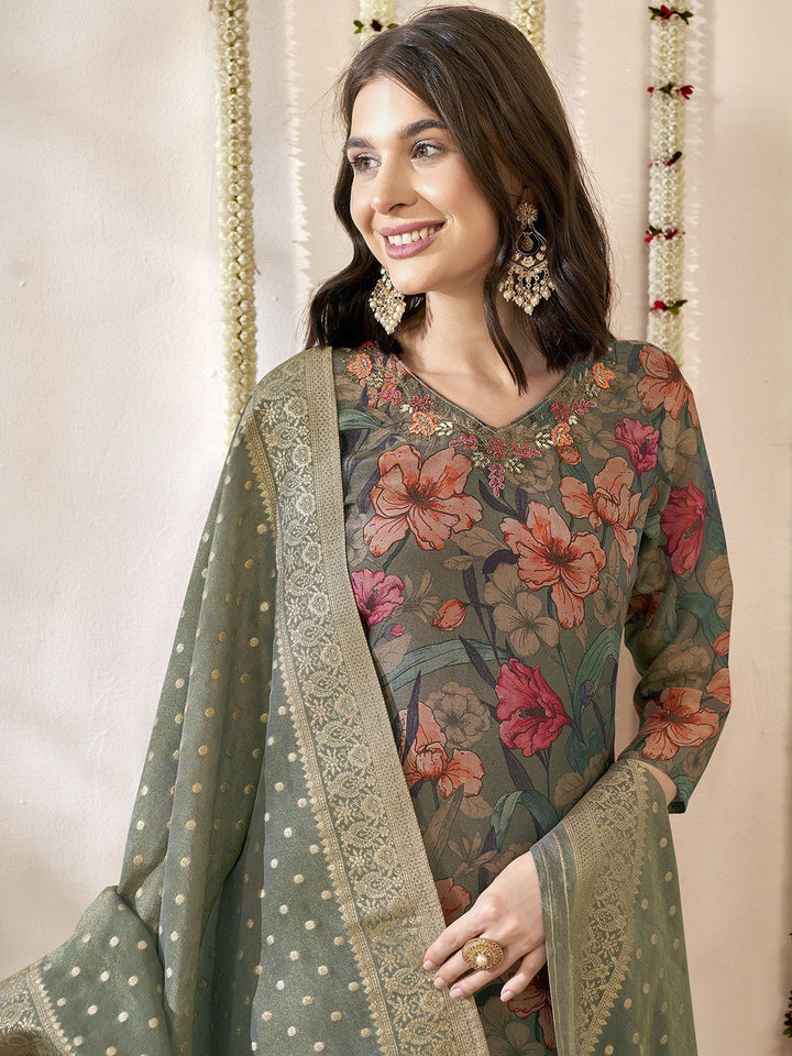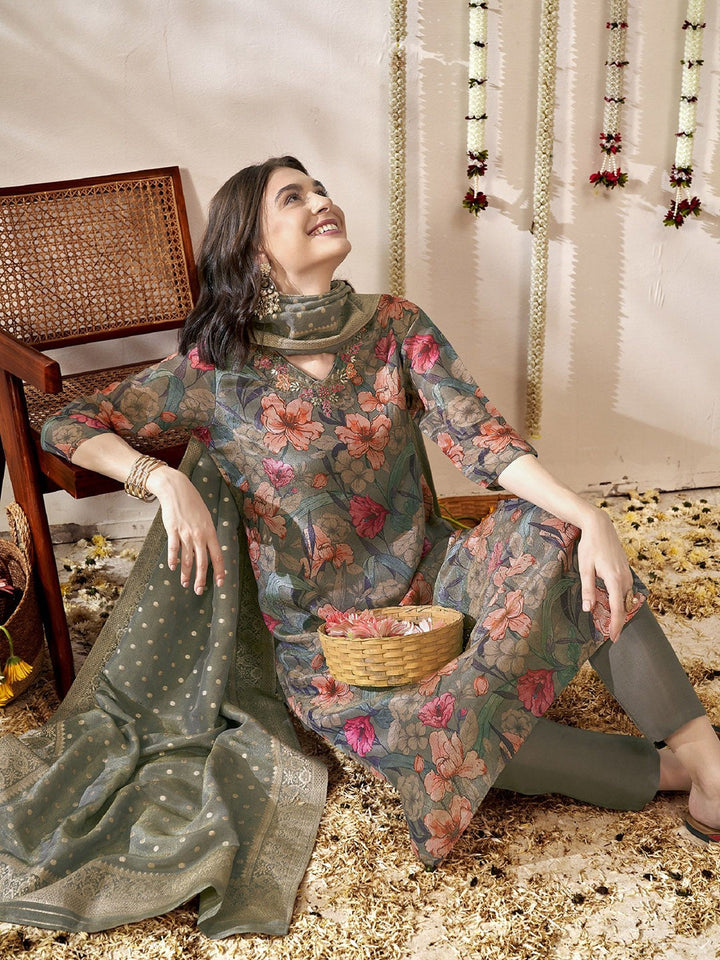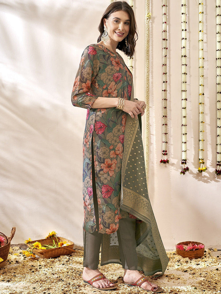 Women Floral Printed Regular Aari Work Kurta with Trousers & With Dupatta